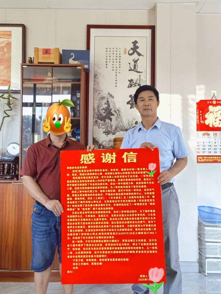 案件结束后,委托人韦某某亲手送上锦旗与感谢信,信中写道: