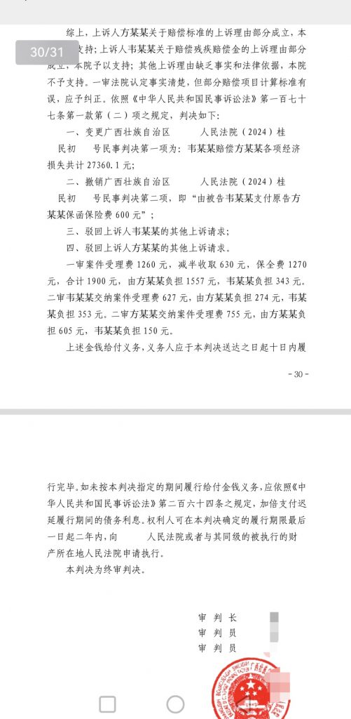 2025年7月29日,某市中院作出(2024)桂10民终XXXX号民事判决,采纳韦忠华律师核心观点,判决如下:
