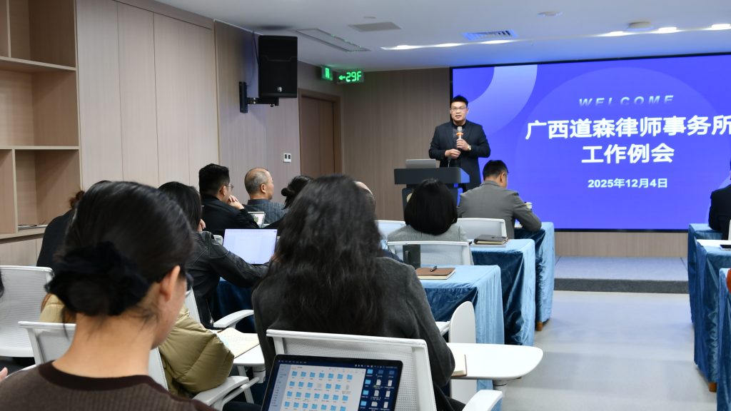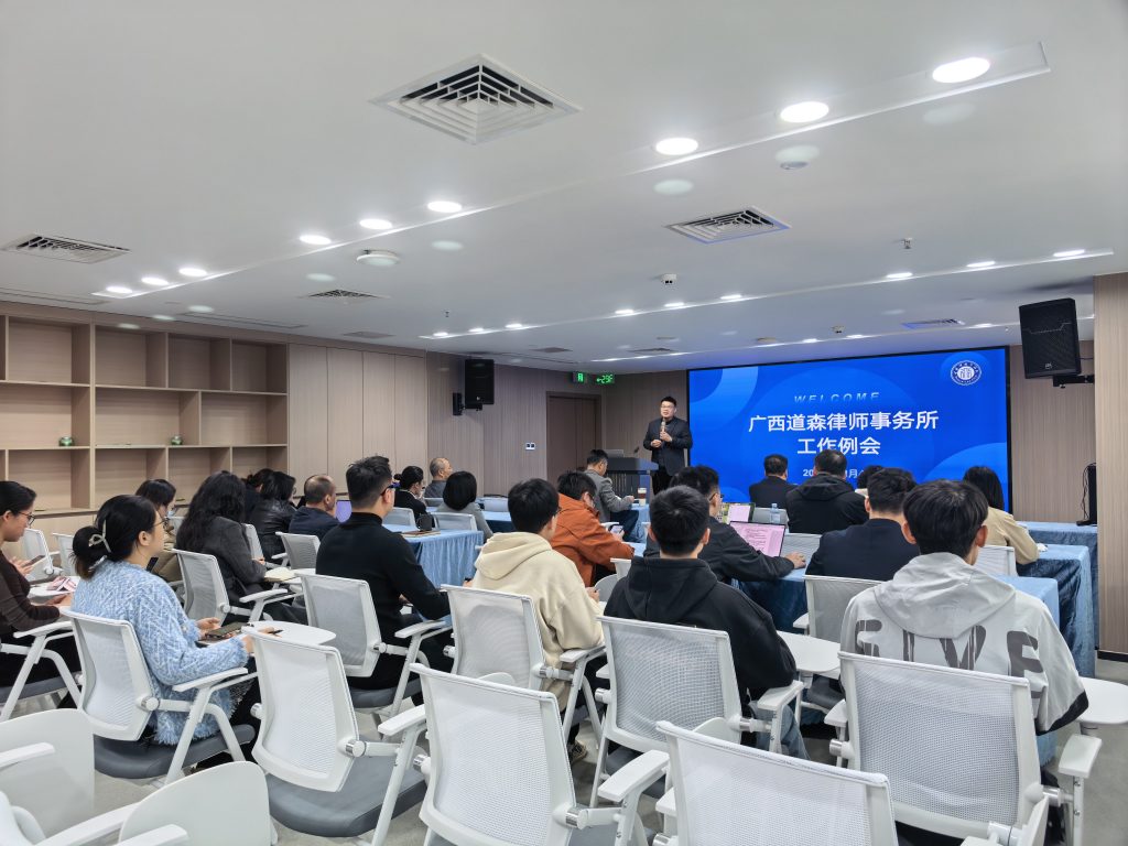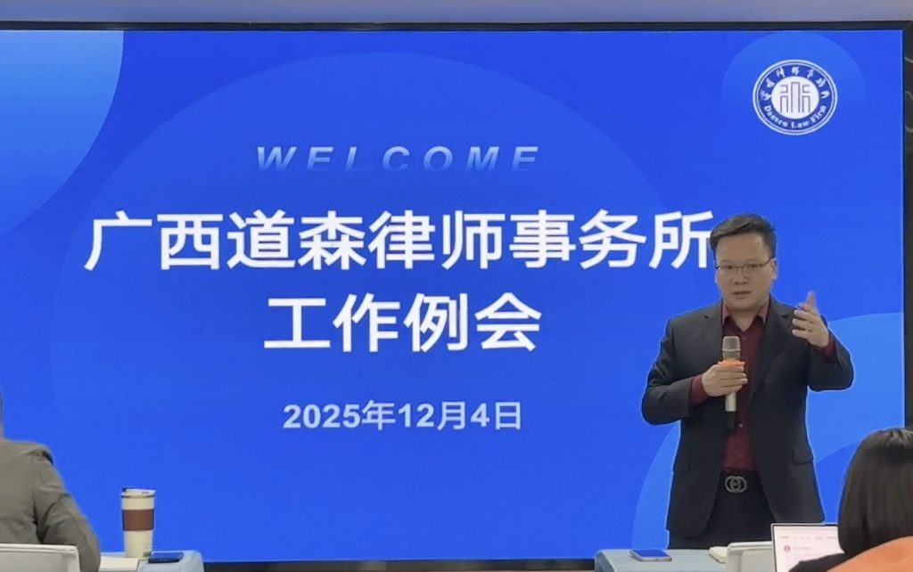 2025年12月4日,广西道森律师事务所召开12月工作例会暨业务分享会。本次会议由律所合伙人、执行主任韦荣画律师主持,合伙人李海霞为全体人员分享法律实务,这是道森律所新办公室正式启用后的首次集体会议。