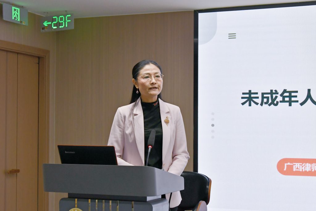 在嘉宾分享环节,三位行业资深律师带来了干货满满的实务经验分享。广西律师协会未成年人保护专业委员会副主任黄春芳律师以《未成年人刑事司法保护之律师路径》为题,系统阐述了律师在涉未成年人刑事案件中的关键作用。她指出,目前律师办理涉未成年人刑事案件基本上属于法律援助案件,呼吁建立专门的涉未成年人案件法律援助律师库,加强对承办律师的专业培训,以提升保护的专业性和有效性。她还结合具体案例,提出了将法律援助时间前移、范围适当扩大等前瞻性设想。