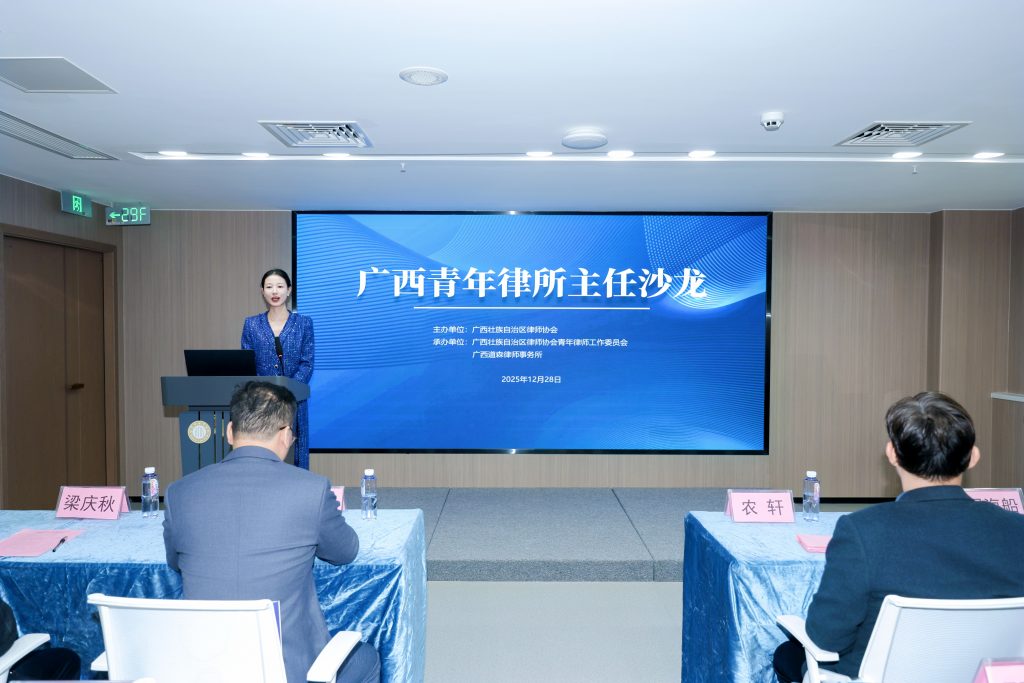 2025年12月28日上午,广西道森律师事务所成立十五周年庆典暨“广西青年律所主任沙龙”在南宁成功举办。本次活动由广西律师协会主办,广西律协青年律师工作委员会与广西道森律师事务所共同承办。广西律师协会副会长农轩、副监事长梁庆秋,南宁市律师协会会长周海船,百色市律师协会会长罗启国,广西律协常务理事、青工委主任梁鹏,北海市律师协会会长邓昌忠,南宁市律师协会副会长蓝斌、韦琳,南宁市伊岭工业发展党工委委员、管委会副主任潘吉敏等领导出席,全区40余家律师事务所的主任、青年负责人及行业代表共60余人齐聚一堂,共庆道森所十五华诞,共话行业高质量发展未来。