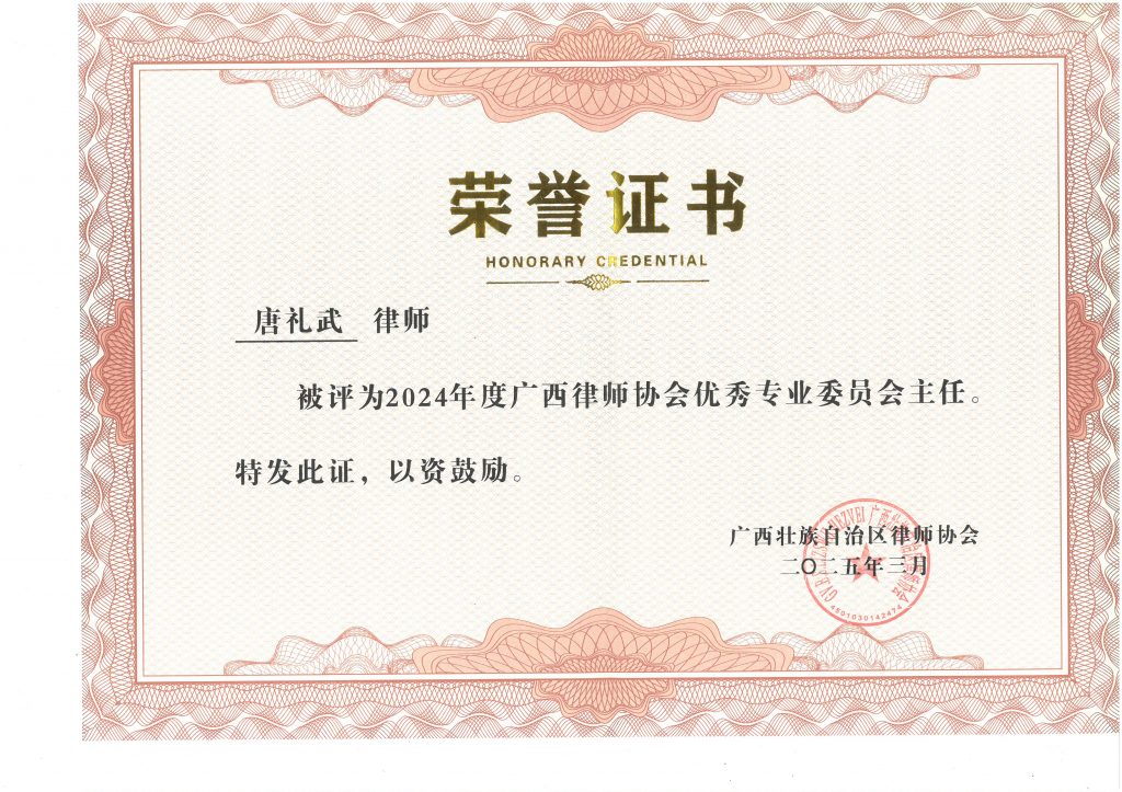 唐礼武、吴霞律师获评广西壮族自治区律师协会专业委员会“优秀主任”称号。