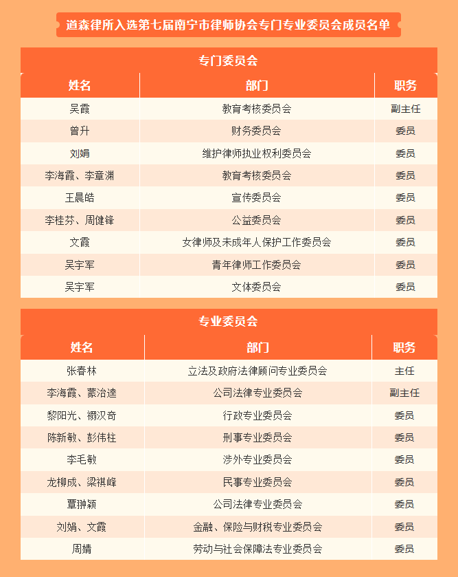 道森所21名律师入选第七届南宁市律师协会18个专门专业委员会。