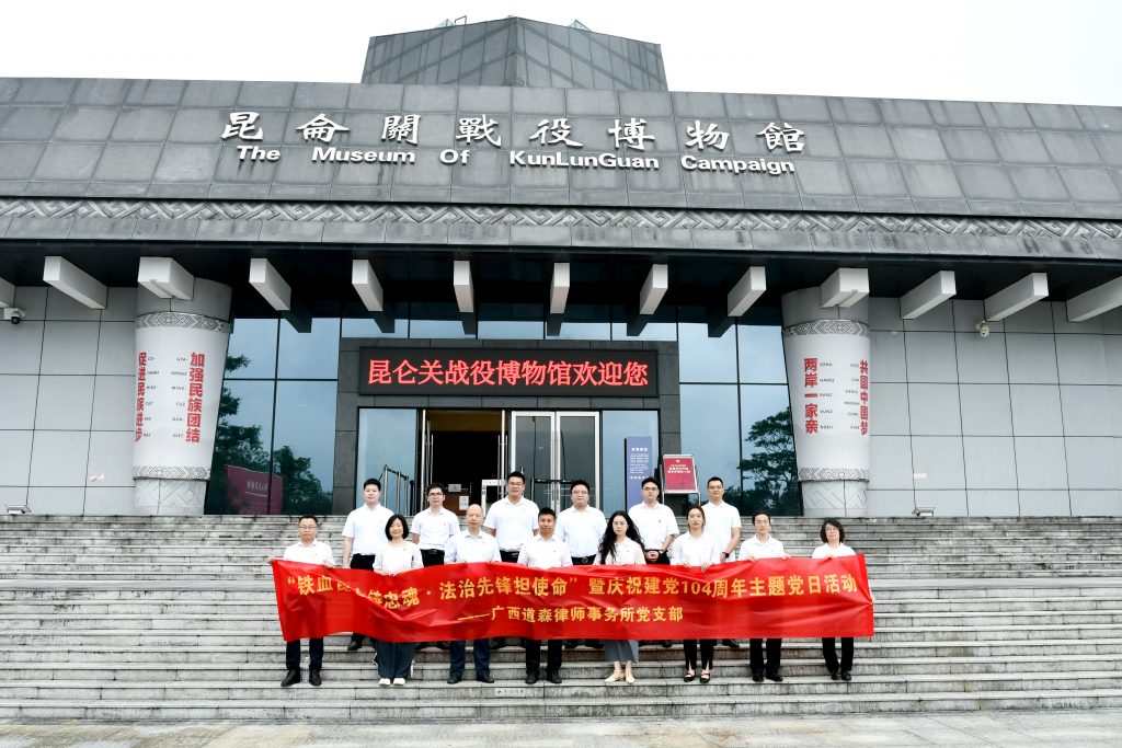 为庆祝中国共产党成立104周年,道森所党支部委员会组织全体党员及入党积极分子,赴爱国主义教育基地昆仑关战役遗址,开展“铁血昆仑铸忠魂·法治先锋担使命”主题党日活动,在革命历史现场接受深刻的精神洗礼。