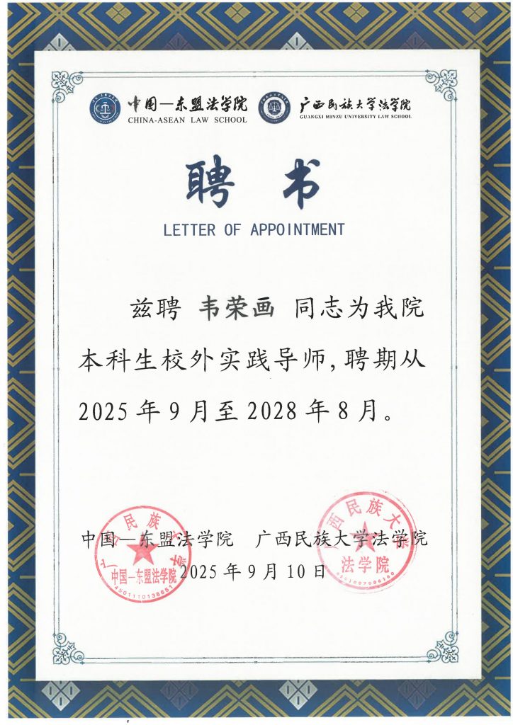 2025年,我们深耕校企合作,不仅走进广西民族大学、广西警察学院、广西财经学院等高校参与专场招聘与双选会,更深度融入高校人才培养体系,蒙治逵律师、韦荣画律师分别受聘为广西民族大学法学院硕士及本科校外实践导师。
