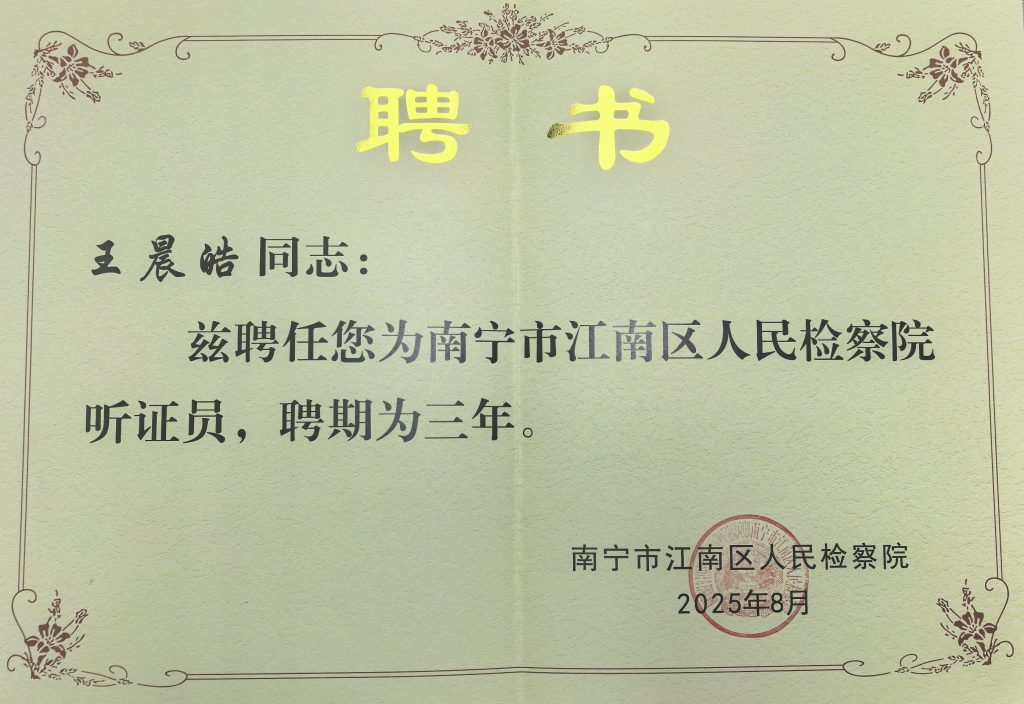 王晨皓律师受聘为南宁市江南区人民检察院第一届听证员。