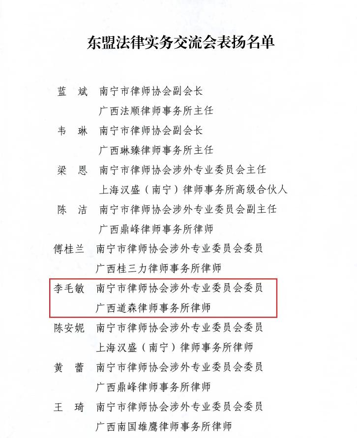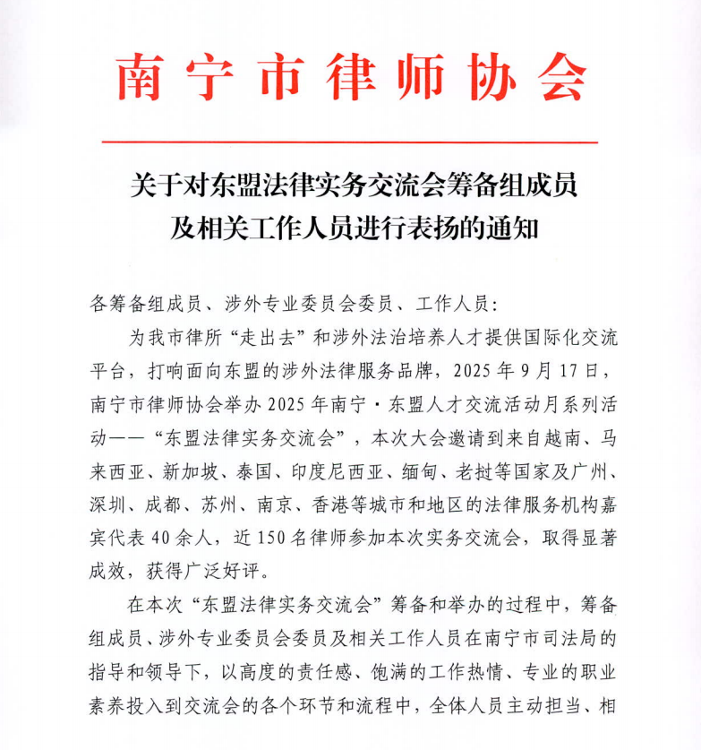 李毛敏律师因在“2025年东盟法律实务交流会”中的出色表现获得通报表扬。