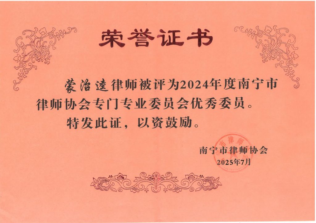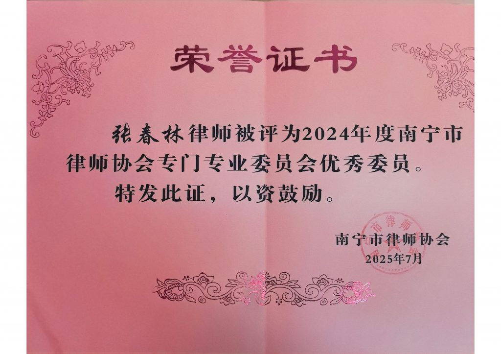 蒙治逵律师、张春林律师荣获“2024年度南宁市律师协会专门专业委员会优秀委员”称号。